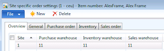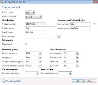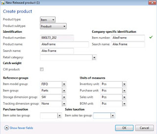 Number of released products will be created in Microsoft Dynamics AX 2012 which will have similar characteristics for the sake of simplicity. All of them will be FIFO controlled, Site and Warehouse will be used as Storage dimensions, default Site and Warehouse settings will be defined for released products and finally cost price will also be defined for all released products (not using BOM calculation for BOMs)