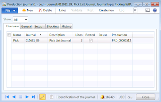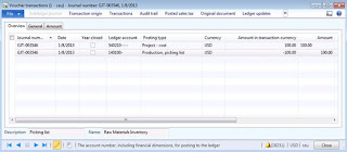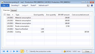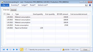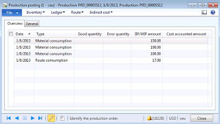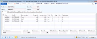In this case I'll pre-flush materials and labor consumption which means that material and labor consumption will be posted up-front. I'll mark "Post picking list now" and "Post route cad now" checkboxes on General tab. I assume that there's enough on-hand for the components to be consumed in production process.