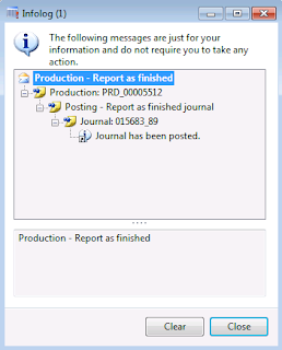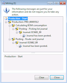 As the result the following message will be displayed informing that Picking list journal and Route card journal have been posted for the consumption of material and labor