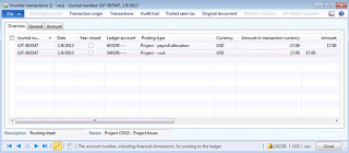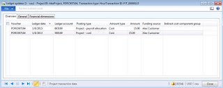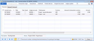 Ledger voucher provides details on which account was credited for "Project – payroll allocation" and which account was debited for "Project – cost"