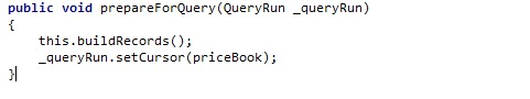 To achieve that successfully, we need to override the "prepareForQuery" method of the AxD class, and do a "setCursor" of the existing "QueryRun" object with the temporary table (which needs to be populated before that).