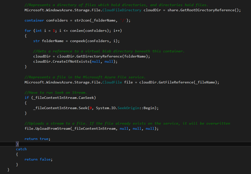 /// <summary> /// Upload file to azure file storage /// </summary> /// <param name = "_fileContentInStream">File stream</param> /// <parmam name = "_folderName">Folder where file saves</param> /// <param name = "_fileName">File name</param> /// <returns>True or False</returns> public static boolean uploadFileToAzureFileStorage(System.IO.Stream _fileContentInStream , str _folderName, str _fileName) { try { //Getting azure credentials from vend parameter tables (in my case) VendParameters vendParameter = VendParameters::find(); //Setting connection Microsoft.WindowsAzure.Storage.Auth.StorageCredentials storageCredentials = new Microsoft.WindowsAzure.Storage.Auth.StorageCredentials("Your storage account name", "Your storage account access key"); Microsoft.WindowsAzure.Storage.CloudStorageAccount storageAccount = new Microsoft.WindowsAzure.Storage.CloudStorageAccount(storageCredentials, true); //Provides a client-side logical representation of the Microsoft Azure File service. //This client is used to configure and execute requests against the File service. Microsoft.WindowsAzure.Storage.File.CloudFileClient fileClient = storageAccount.CreateCloudFileClient(); //Represents a share in the Microsoft Azure File service. Microsoft.WindowsAzure.Storage.File.CloudFileShare share = fileClient.GetShareReference("Your file share name"); //If not exist throw error if (!share.Exists(null, null)) { throw error(strFmt("File share not exists.")); } //Represents a directory of files which hold directories, and directories hold files. Microsoft.WindowsAzure.Storage.File.CloudFileDirectory cloudDir = share.GetRootDirectoryReference(); container conFolders = str2con(_folderName, '/'); for (int i = 1; i <= conlen(conFolders); i++) { str folderName = conpeek(conFolders, i); //Gets a reference to a virtual blob directory beneath this container. cloudDir = cloudDir.GetDirectoryReference(folderName); cloudDir.CreateIfNotExists(null, null); } //Represents a file in the Microsoft Azure File service. Microsoft.WindowsAzure.Storage.File.CloudFile file = cloudDir.GetFileReference(_fileName); //Have to run Seek on Stream. if (_fileContentInStream.CanSeek) { _fileContentInStream.Seek(0, System.IO.SeekOrigin::Begin); } //Uploads a stream to a file. If the file already exists on the service, it will be overwritten file.UploadFromStream(_fileContentInStream, null, null, null); return true; } catch { return false; } } |