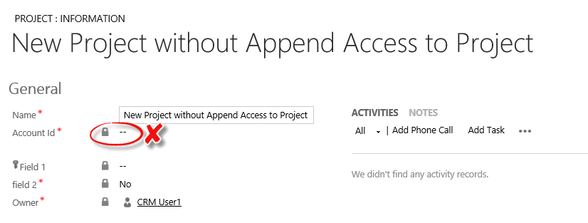 When you want to create a Project, you cannot select any lookup value to Account because you don’t have privilege to Append To an Account.