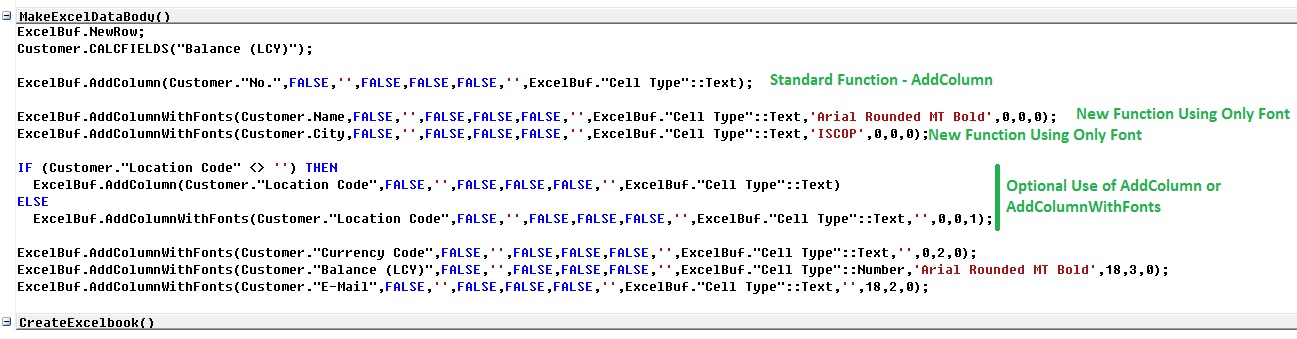 7. While Exporting data we use AddColumn Function of Excel Buffer Table, now with the extension code that we have discussed we can use both the function i.e AddColumn and AddColumnwithFonts.