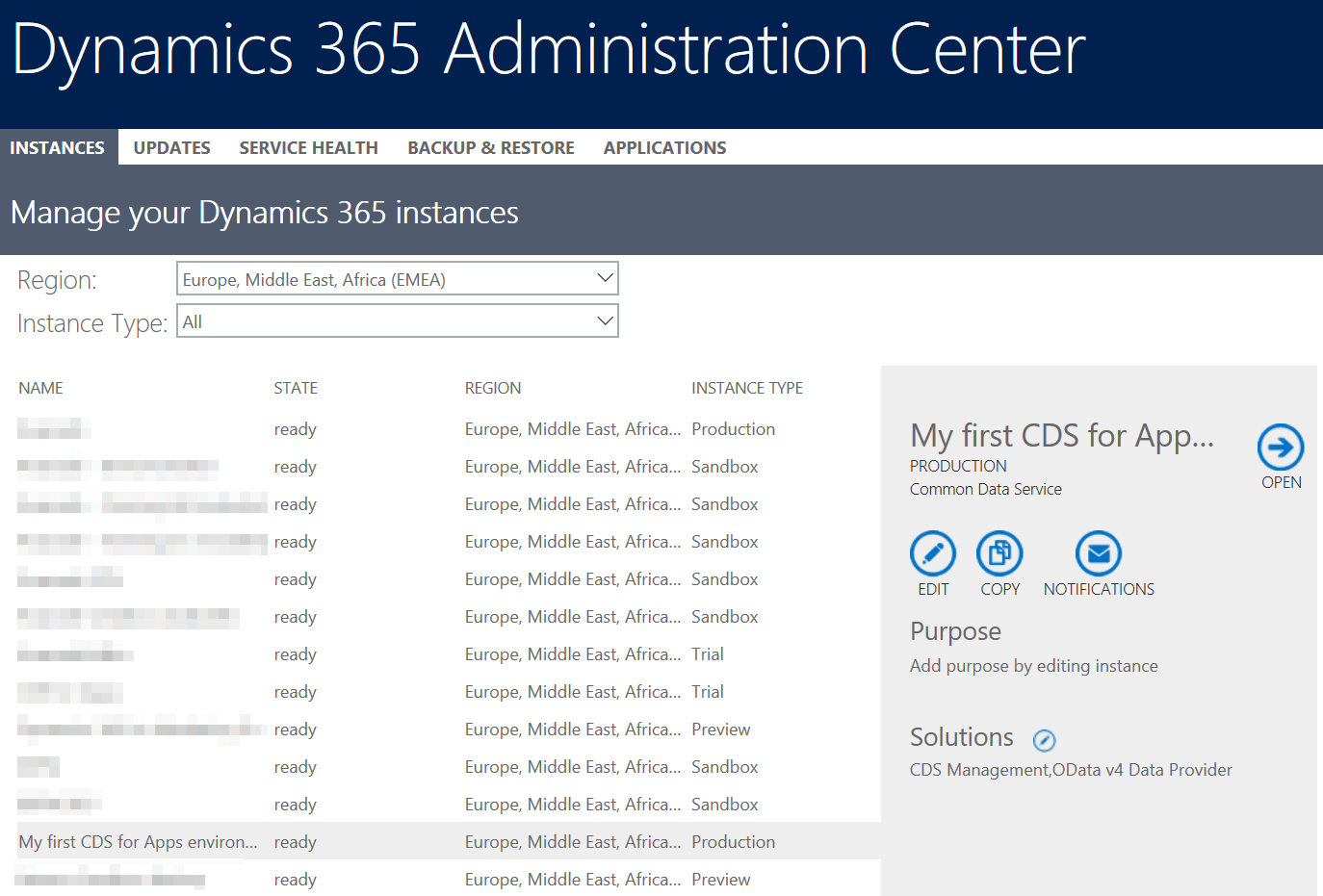As you can see in the screenshot below, it offers the same options as a "classic" Dynamics 365 Customer Engagement instance: you can edit the instance Name, URL, Type (Production / Sandbox), Security Group, and you can also copy it to a sandbox (even a Dynamics 365 Customer Engagement one).