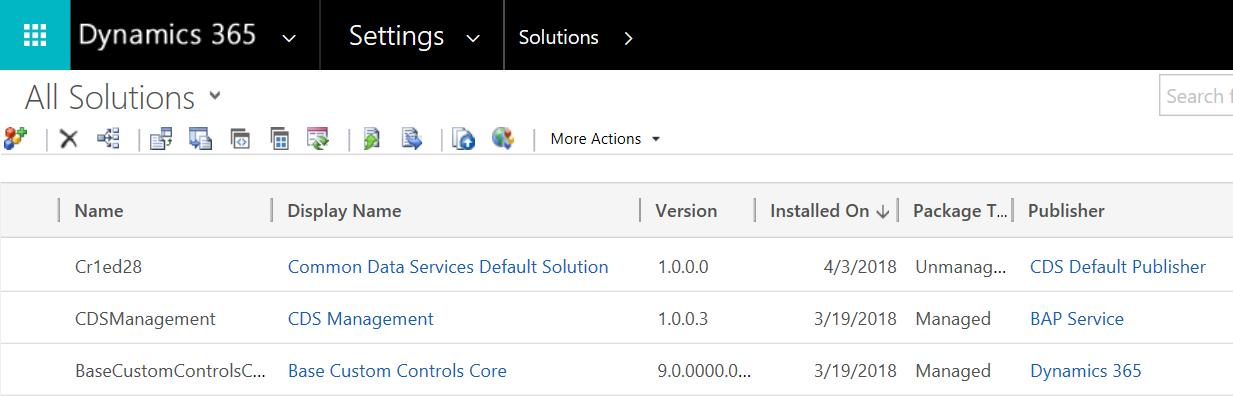 - Common Data Services Default Solution. This unmanaged contains all customizations you have done from PowerApps (https://web.powerapps.com/).