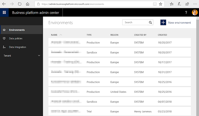Now that you're licensed, simply log into the Microsoft Business Platform admin center (or in the PowerApps admin center, in fact it's the same thing). Here, you will find all your existing Dynamics 365 Customer Engagement and Common Data Service for Apps instances / environments: