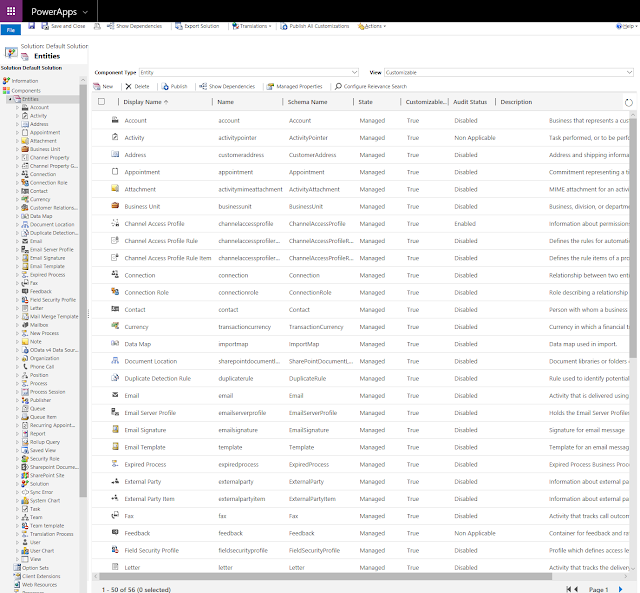 Microsoft has accomplished quite a tour de force! They completely striped down the environment from what used to be core business entities such as Lead, Opportunity, Case, Campaign... Those are now included in dedicated solutions and packaged as apps.The Default Solution contains in fact very few functional objects: Account, Contact and Activity entities. The rest is just configuration related. Out-of-the-box, the system contains only 56 entities (these are the entities visible in the solution, if you browse the metadata, there are 312 entities, a lot of them technical, but still no opportunity, case, etc.). To give you a comparison, vanilla instances of Dynamics 365 Customer Engagement (with no applications such as Field Service, Sales, etc. installed) contain 130 entities in the Default Solution.