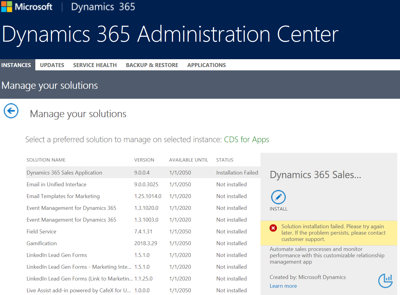 I tried to trick the system and install the Dynamics 365 Sales Application, but it failed, maybe because of missing dependencies or by protection mechanism to prevent people to add Dynamics 365 Customer Engagement apps on basic PowerApps Common Data Service for Apps environments.