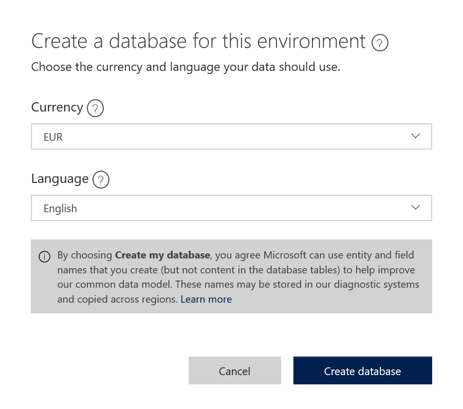 Click on "New environment", fill-in a name, a region (the region must be the same as your Azure AD if you plan to create a database), and the type of environment (Production or Trial).
