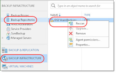 In Veeam, click on the Backup Infrastructure button in the bottom left, then click on the Backup Repositories page. Right click on the Backup Repository that is giving the error, and select Rescan.