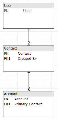 I will try to explain the solution with the out-of-the-box entities as an example for better understanding. Let's say the maker wants to collect a Collection of Account data with an additional user GUID column of the Created By of the related Primary Contact. Here's the relationship diagram for those 3 entities involved in this example.